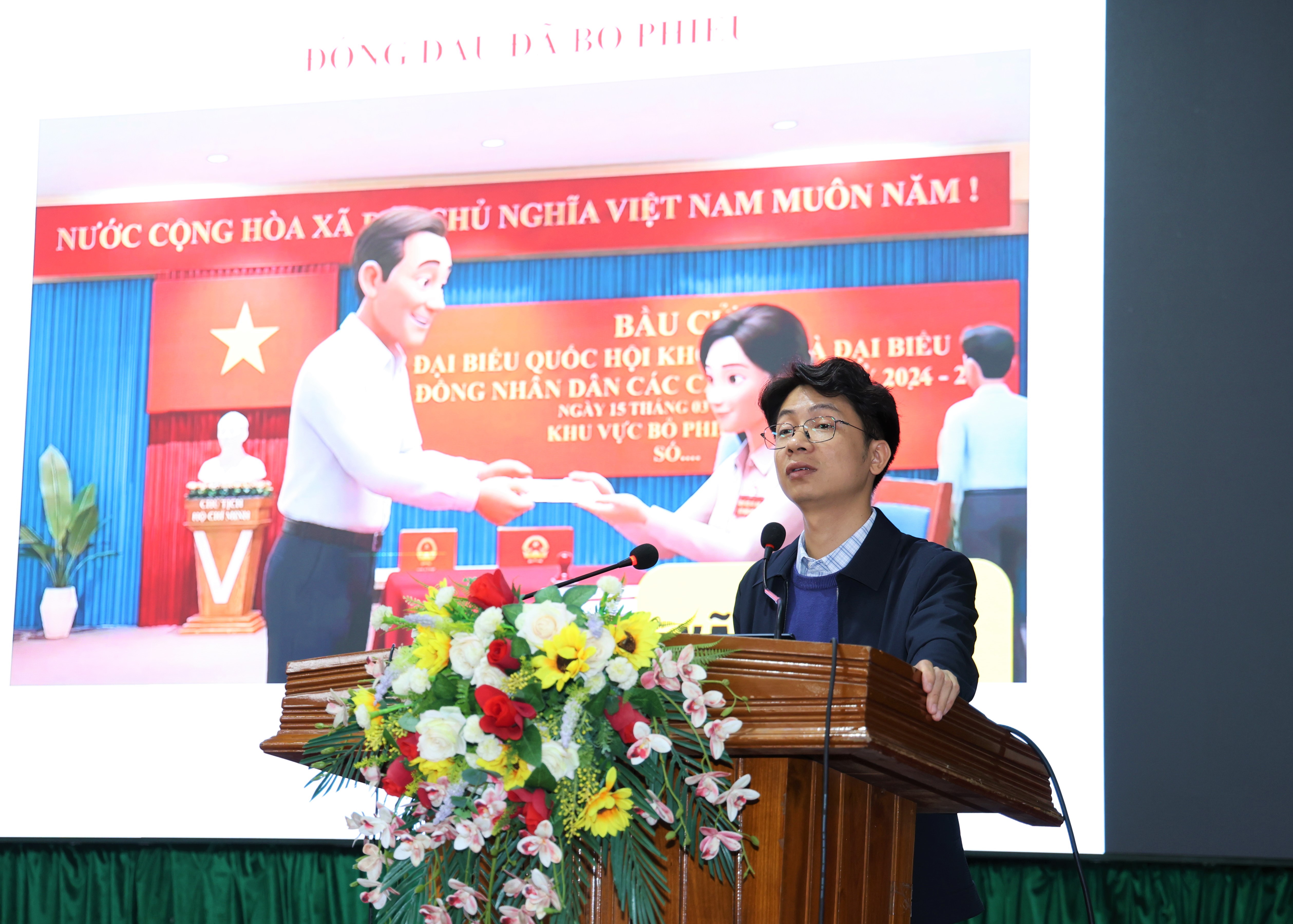 Trưởng phòng VHXH xã Toàn Lưu Phạm Kim Trung hướng dẫn cử tri quy trình bỏ phiếu và các nội dung liên quan đến công tác bầu cử