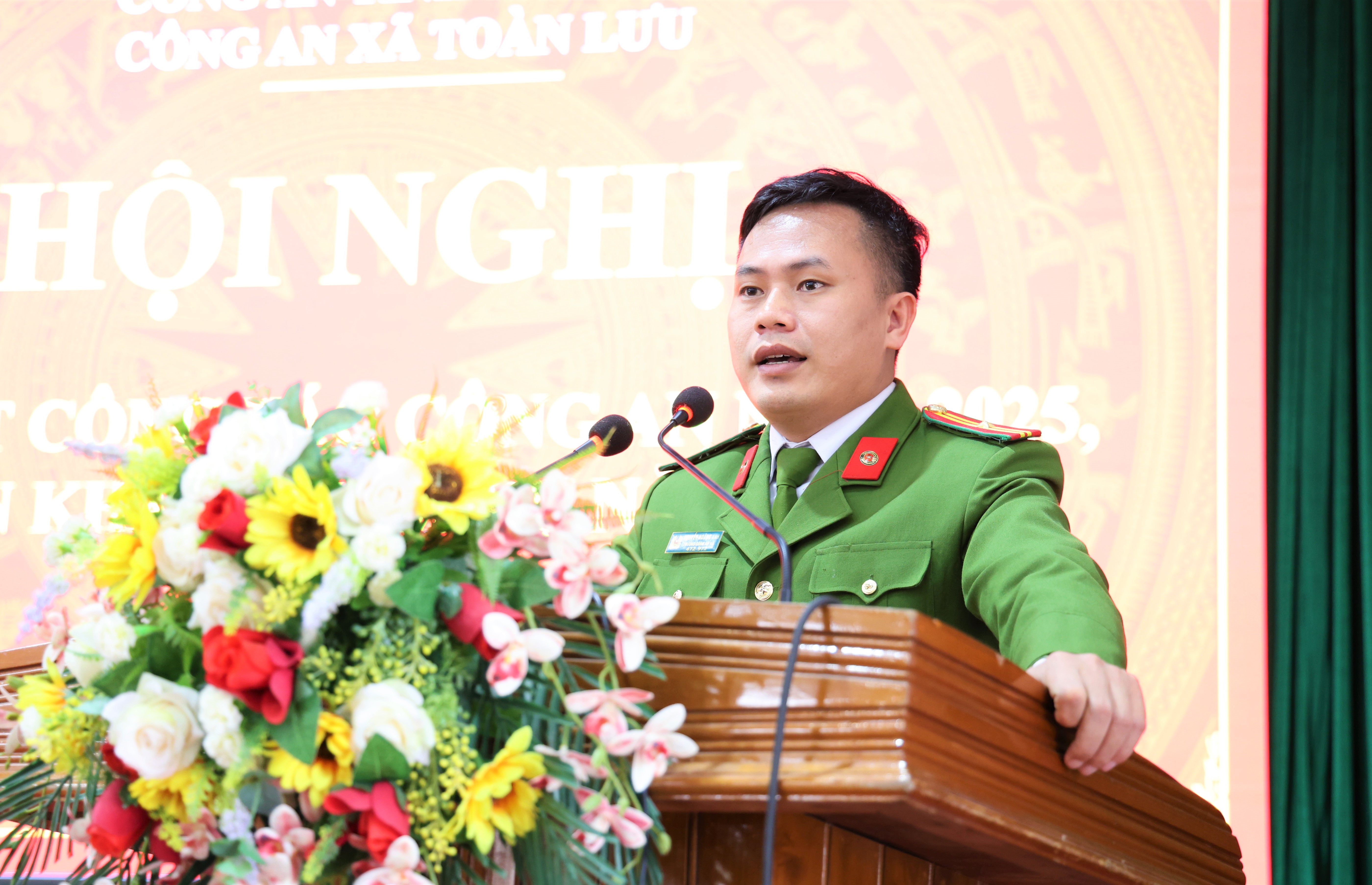 Trưởng Công an xã Toàn Lưu Thiếu tá Nguyễn Hoàng Anh báo cáo kết quả công tác Công an năm 2025, triển khai nhiệm vụ năm 2026