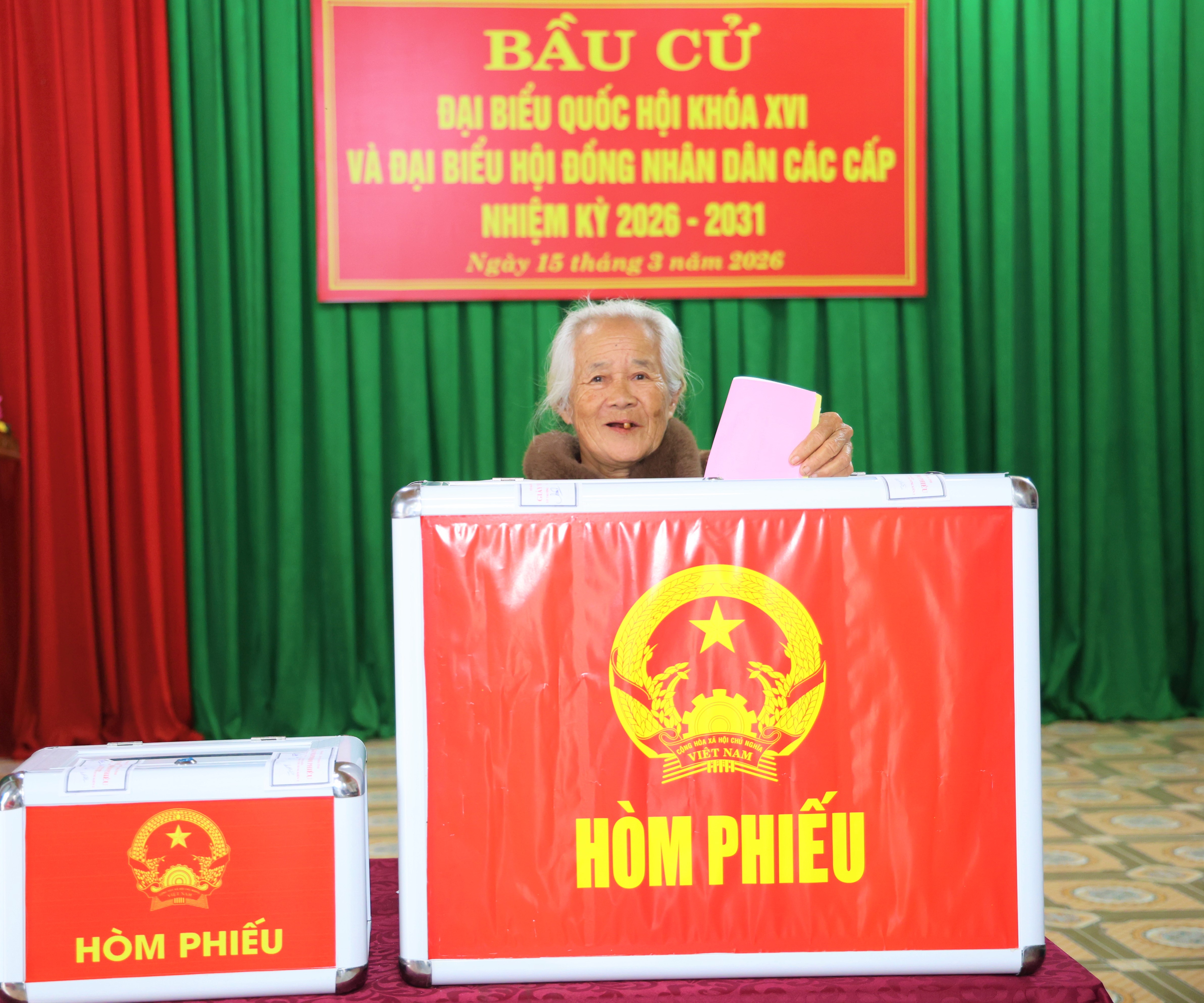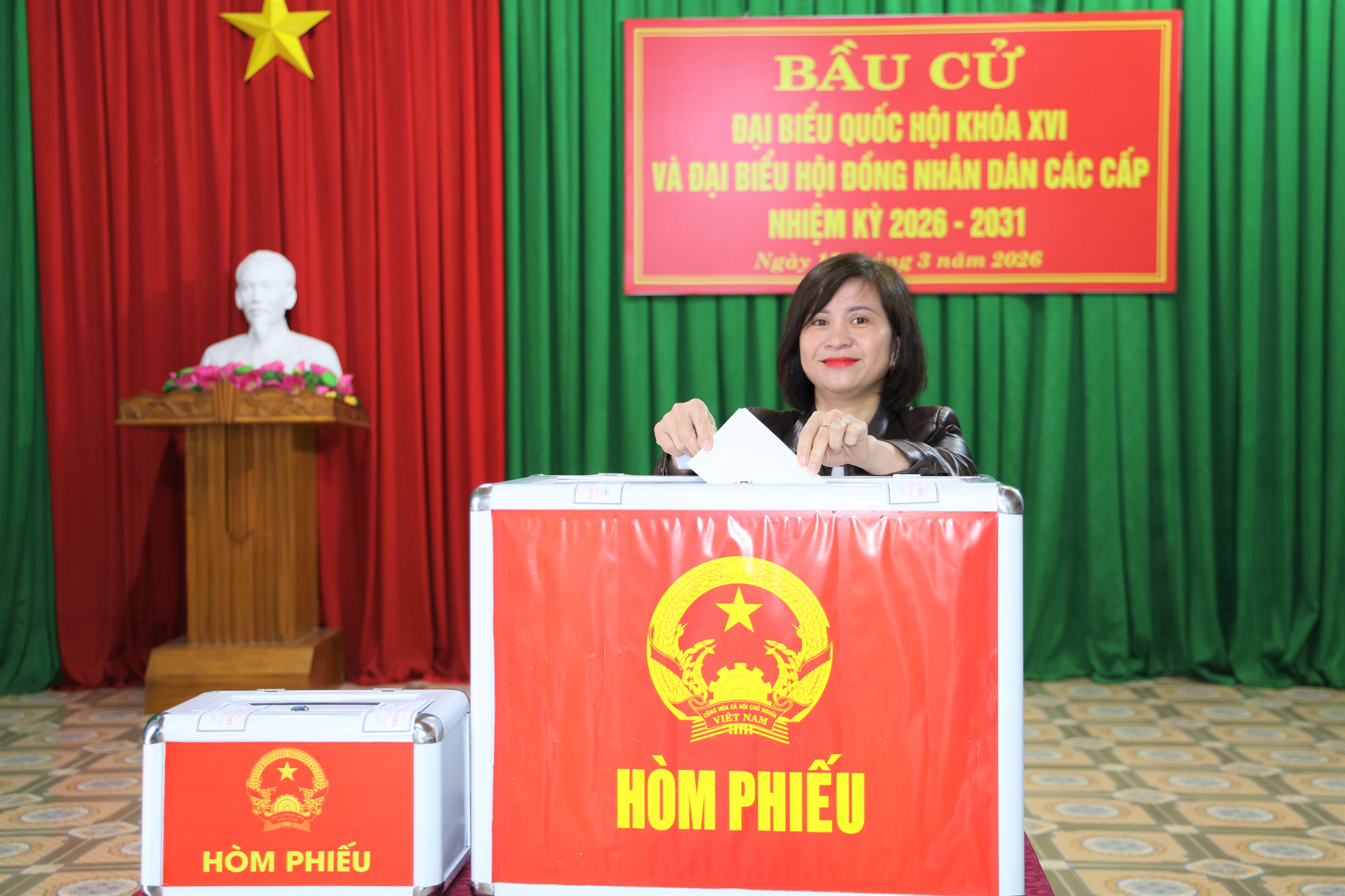 Là cử tri đầu tiên bỏ phiếu bầu cử tại khu vực bỏ phiếu số 13 ( địa điểm nhà văn hóa thôn Vĩnh An), bà Lê Thị Hường tươi cười, bầu chọn ra những đại biểu Quốc hội, HĐND các cấp, NK 2026 -2031. Sau khi cẩn thận kiểm tra lá phiếu, bà nhẹ nhàng bỏ phiếu vào hòm phiếu với nét mặt đầy tự hào, tin tưởng. Bà Hương vui mừng chia sẻ: “ Tôi rất vinh dự khi là người đầu tiên bỏ phiếu trong ngày hôm nay. Tôi mong muốn những người đại biểu được bầu sẽ thực hiện tốt chương trình hành động của mình, tâm huyết, trách nhiệm với công việc của người đại biểu dân cử, xứng đáng là đại diện cho ý chí, nguyện vọng của nhân dân, góp phần xây dựng quê hương ngày càng phát triển.”