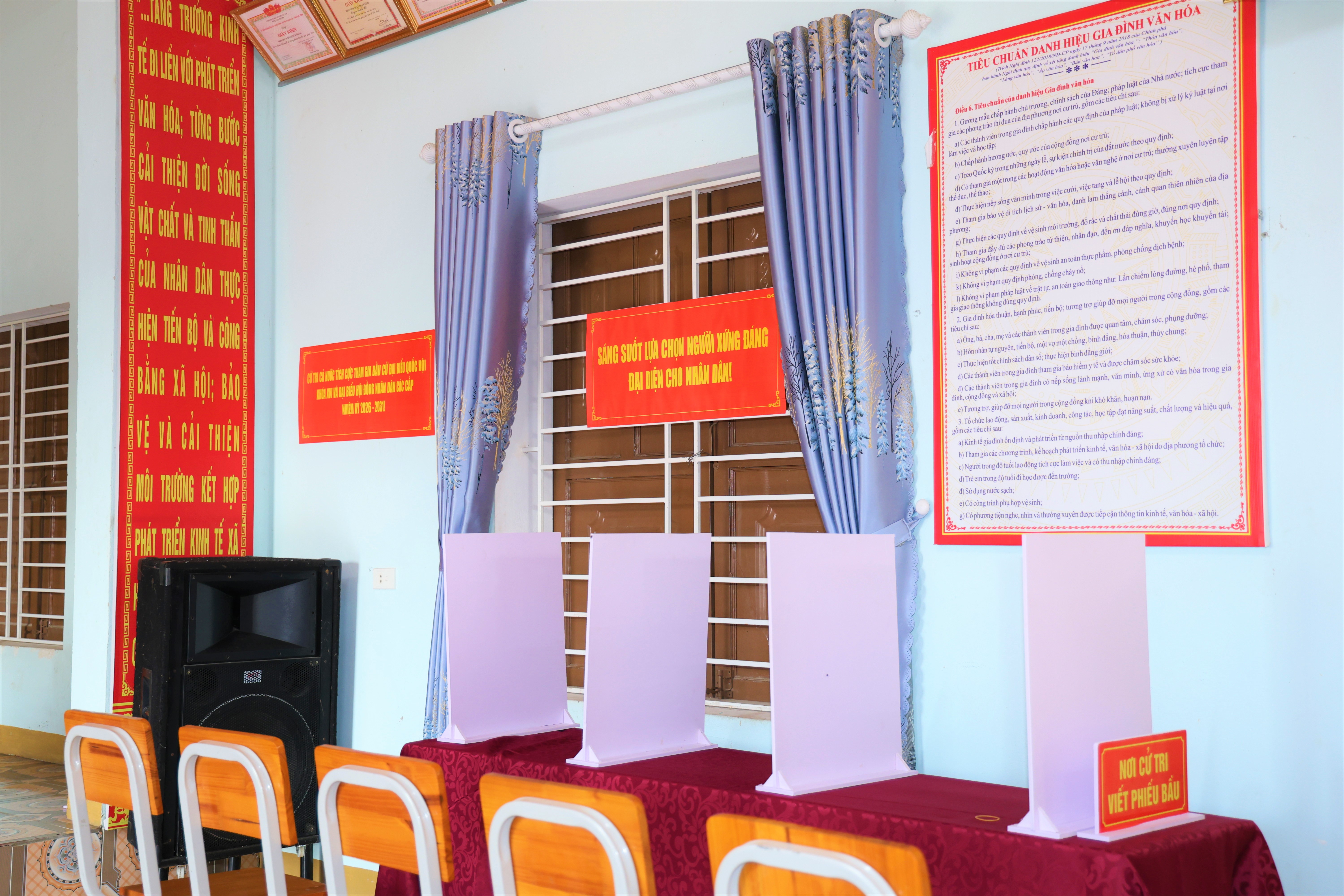 Hòm phiếu, khu vực viết phiếu, các bàn hướng dẫn được sắp xếp khoa học