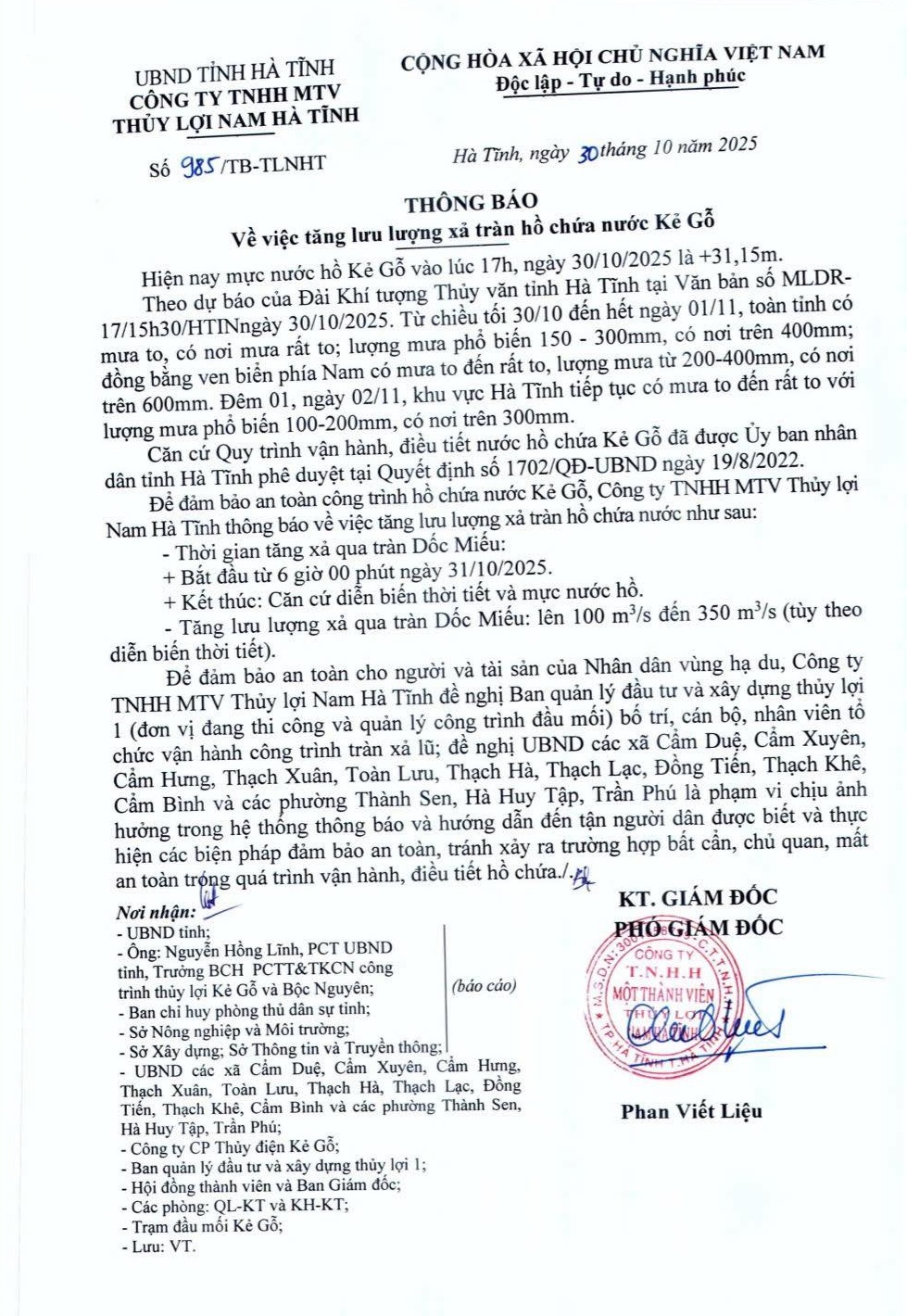 Thời gian xả tràn: Từ 6h00 ngày 31/10/2025
