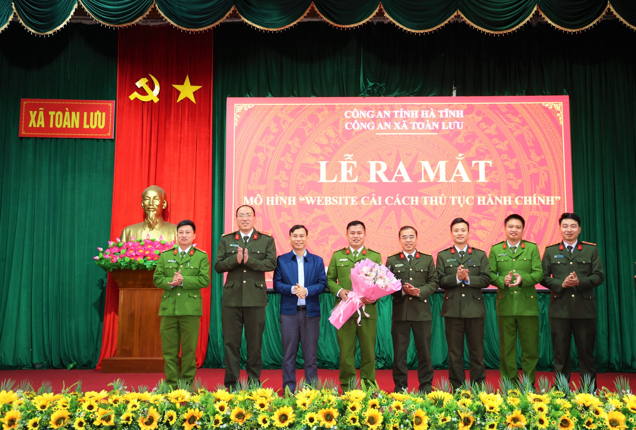 Lãnh đạo xã tặng hoa chúc mừng Công an xã với mô hình Website cải cách thủ tục hành chính mới được đi vào hoạt động