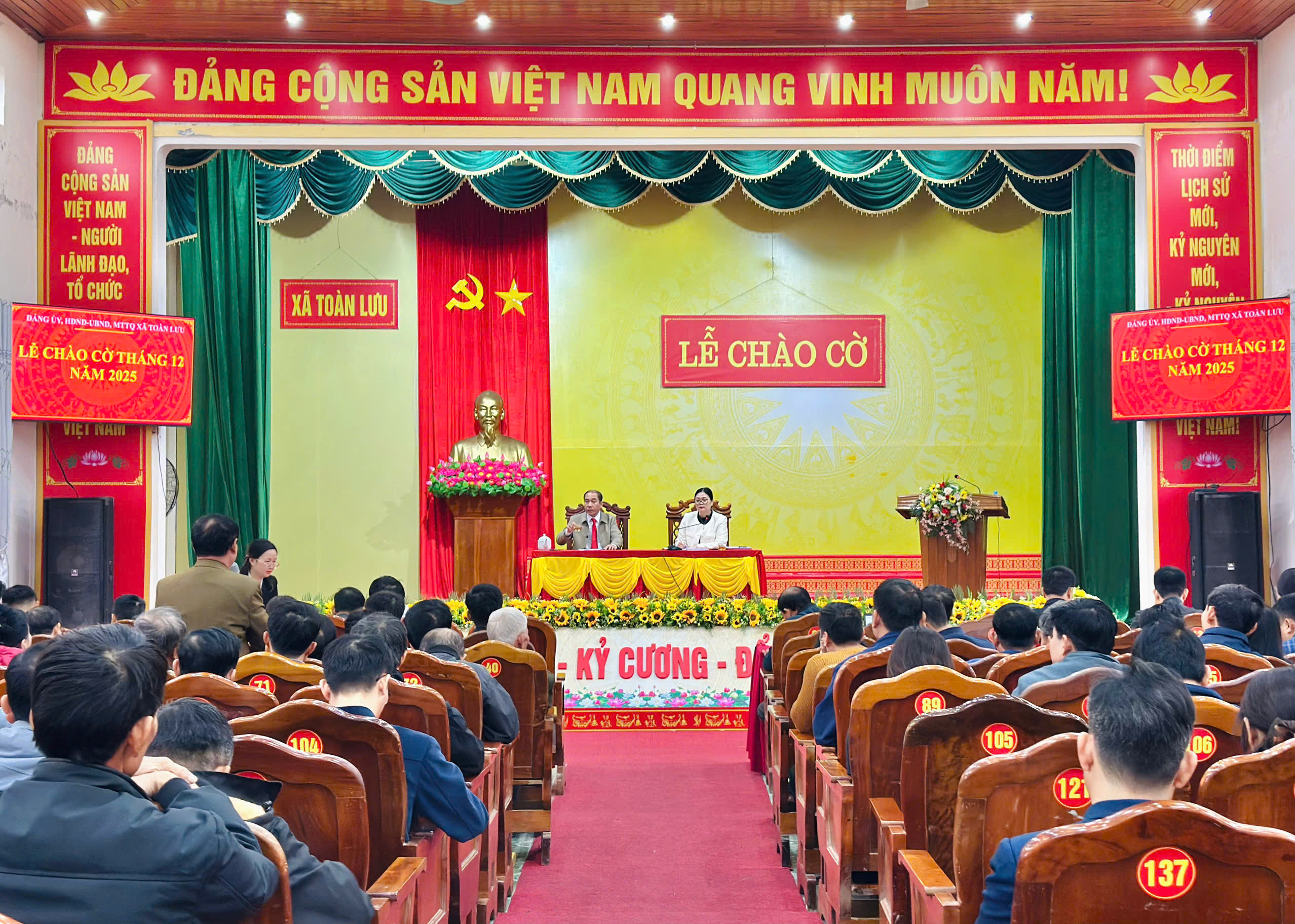 Tại Lễ chào cờ, UBND xã Toàn Lưu đã báo cáo một số kết quả nổi bật trong công tác lãnh đạo, chỉ đạo, thực hiện nhiệm vụ chính trị tháng 11, triển khai nhiệm vụ trọng tâm tháng 12 năm 2025. Về kết quả đạt được, trong tháng qua xã đã chỉ đạo, thực hiện các nhiệm vụ sản xuất vụ Đông, triển khai phòng chống dịch bệnh trên cây trồng, vật nuôi; làm mới gần 1km đường GTNT tại các thôn Tây Sơn, Kim Sơn; 245m kênh mương nội đồng; di dời 100m hàng rào mở rộng đường GTNT; Hoàn thành việc rà soát hộ nghèo, hộ có mức sống trung bình và thu nhập bình quân đầu người trên địa bàn xã; Hoàn thành hồ sơ thiết kế cơ sở hạ tầng các khu tái định cư đường sắt tốc độ cao.